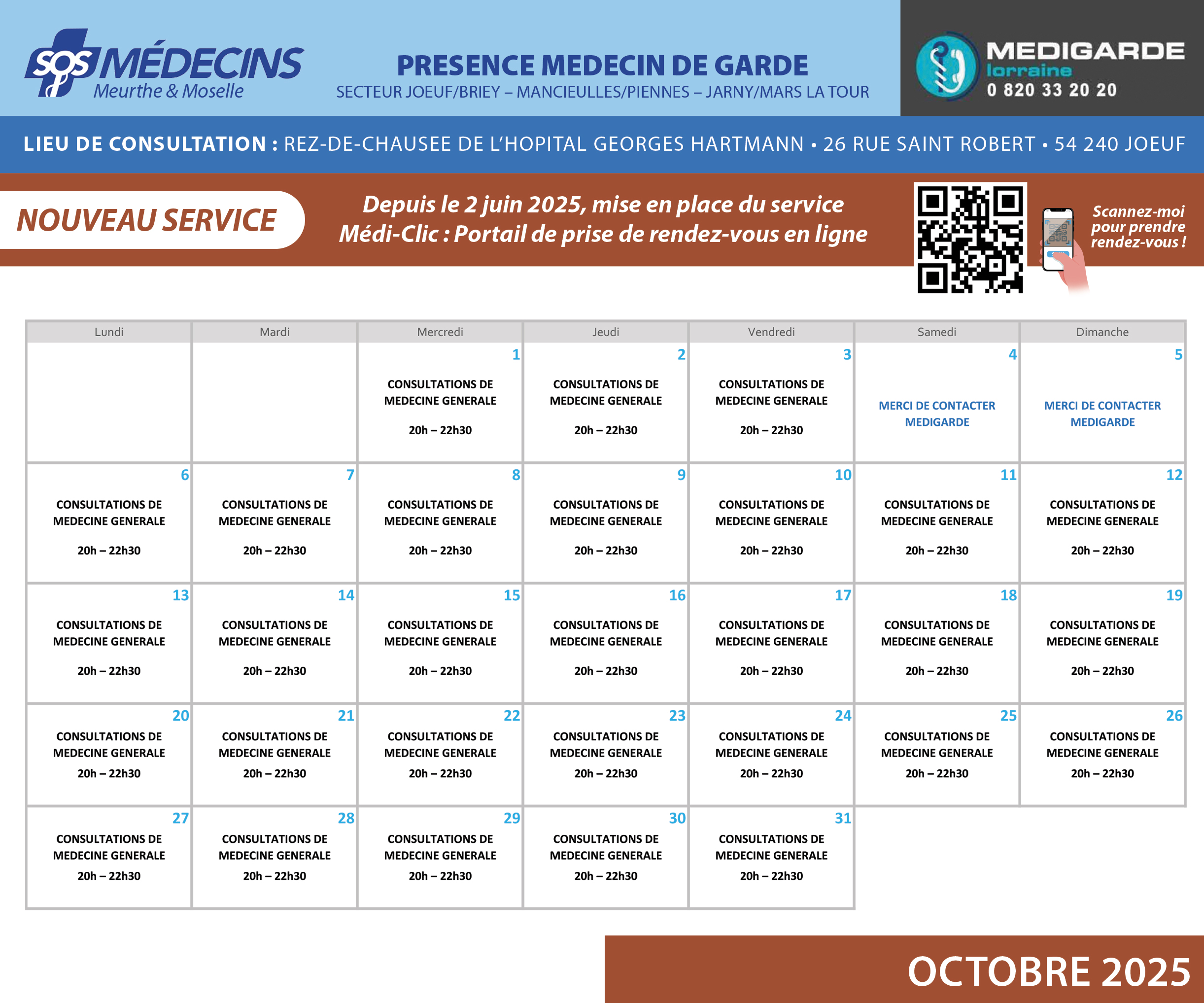 Nous vous relayons les présences de SOS Médecins au sein de l’Hôpital J.G. Hartmann – 26 rue Saint Robert à Joeuf (au rdc du bâtiment A) dans le cadre des permanences de soins la nuit de 20h à 22h30.